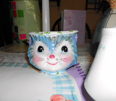 Below is a Kitty Sugar bowl that my daughter found in an Antique shop. I used to have the Teapot, sugar and creamer when the children were little and it is now gone, sadly. But when she saw it she thought I would like it for the memories and that perhaps I could use it as a planter....