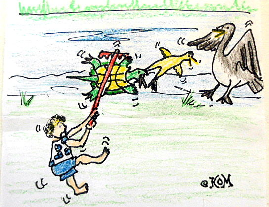 HI THERE! Since there are no pictures of my turtle/gosling adventure, I have drawn a cartoon of it! The turtle has been raked ashore and is upside down and yet he holds that poor little gosling's leg in his crushing jaws! After this, he rolled back on his feet and I gave him a good thump on the back with the rake and he finally released the poor Canadian Goose baby! I was in my bare feet of course (bad habit) and all that splashing and crashing in the water soaked me with mud and water-ha! But at least the gosling AND the ugly snapping turtle both survived. Whew!